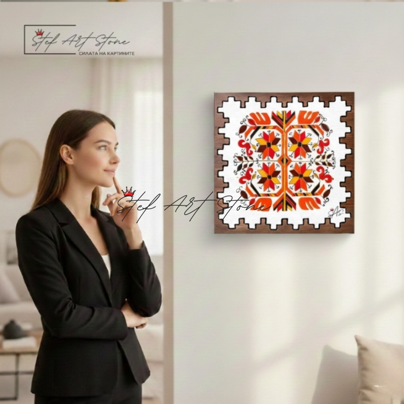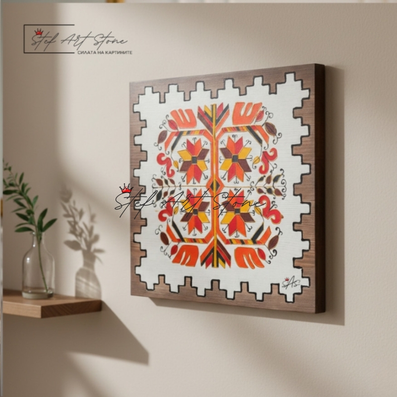 - 🎨 Етно дизайн "Традиция": Характерният за серията назъбен (рустик) борд придава на картината вид на автентичен дърворезбован артефакт.