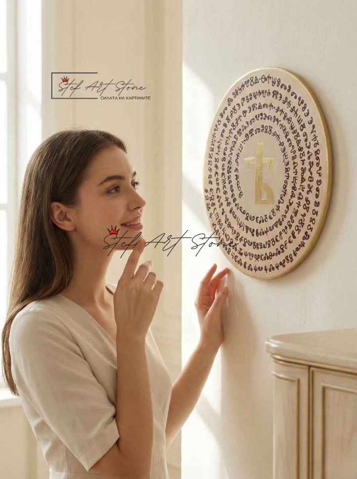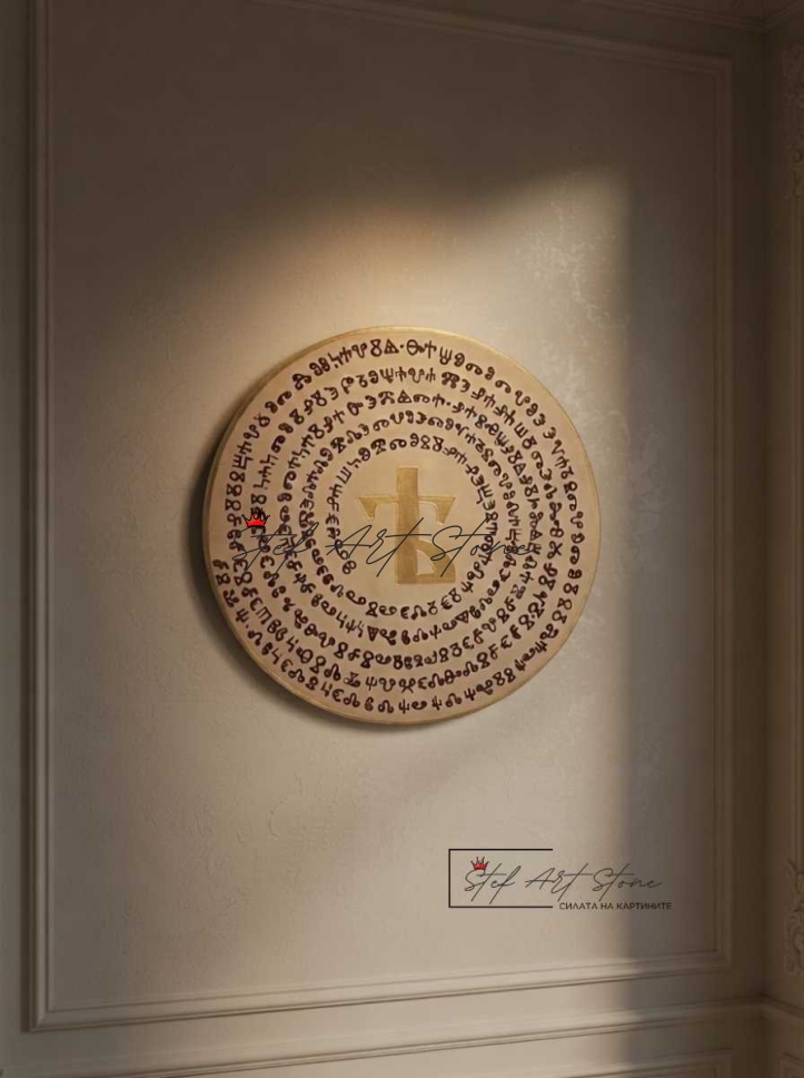 Ръчно изработена картина върху дърво с дълбока символика. Представлява молитвата "Отче наш", изписана с древнобългарската азбука Глаголица, подредена в спирала по часовниковата стрелка – посоката на съзиданието.