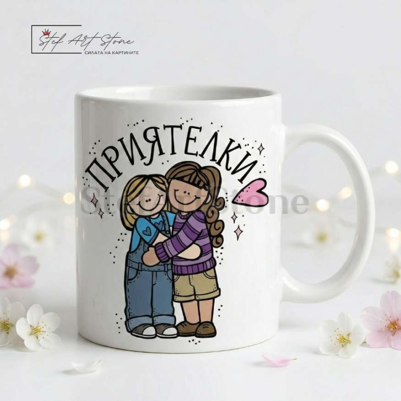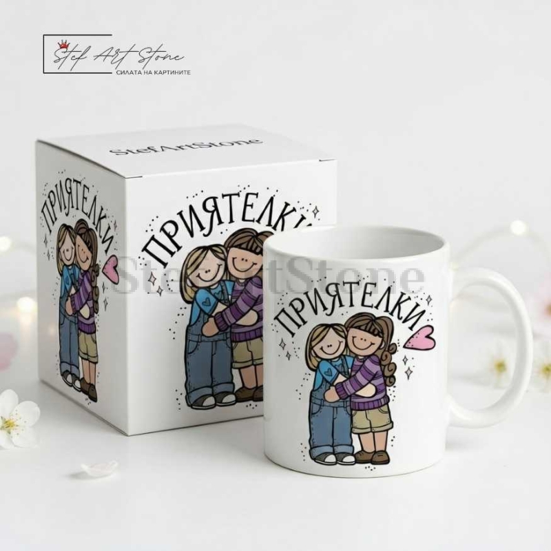Дизайнът включва трогателна илюстрация на две прегърнати приятелки и ясно послание "ПРИЯТЕЛКИ". Нашите персонализирани подаръци са идеалният начин да зарадвате своята най-добра приятелка и да ѝ напомните колко е важна за вас.