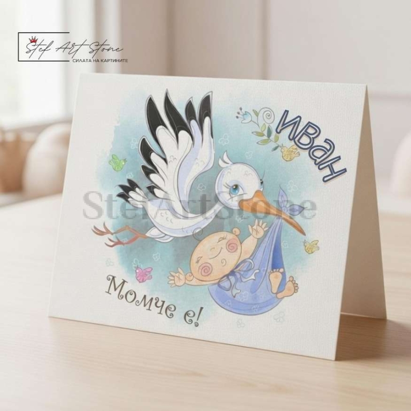 - 👶 Тематичен дизайн: Прекрасна илюстрация в нежни сини тонове със щъркел и бебе, допълнена с категоричен надпис "Момче е!".