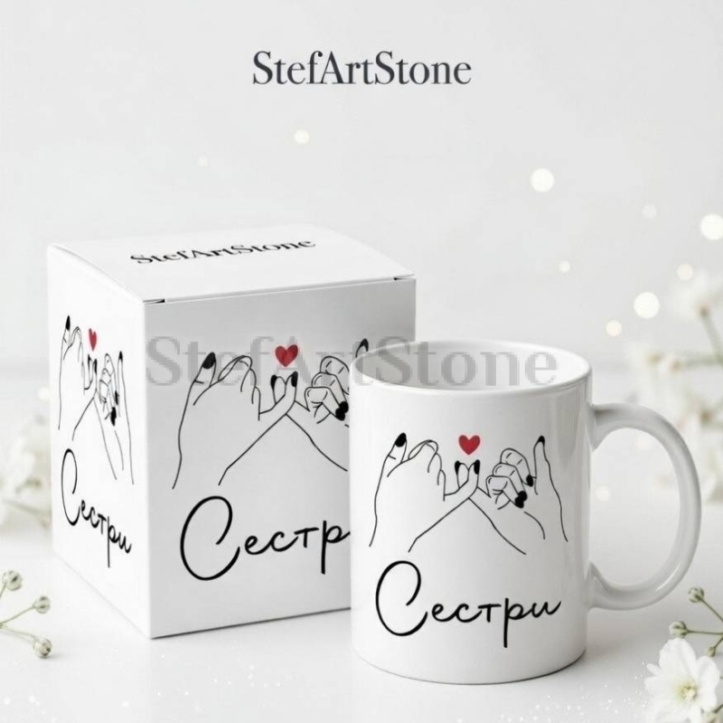 Дизайнът се отличава с модерен минималистичен стил – илюстрация на преплетени кутрета (pinky promise), която символизира неразрушимата сестринска връзка и доверие. Нашите чаши с надпис са сред най-предпочитаните решения, защото предлагат емоция, която остава в ежедневието.