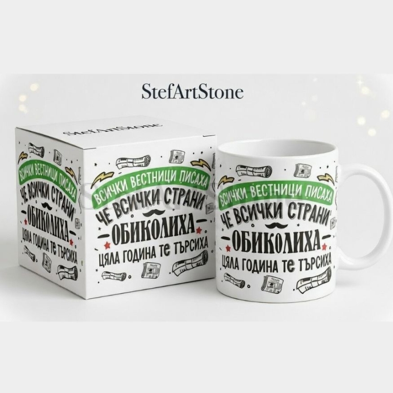- 📰 Уникален дизайн: Креативна илюстрация в стил ретро вестник, допълнена със забавни детайли като мустак, папийонка и трофей.