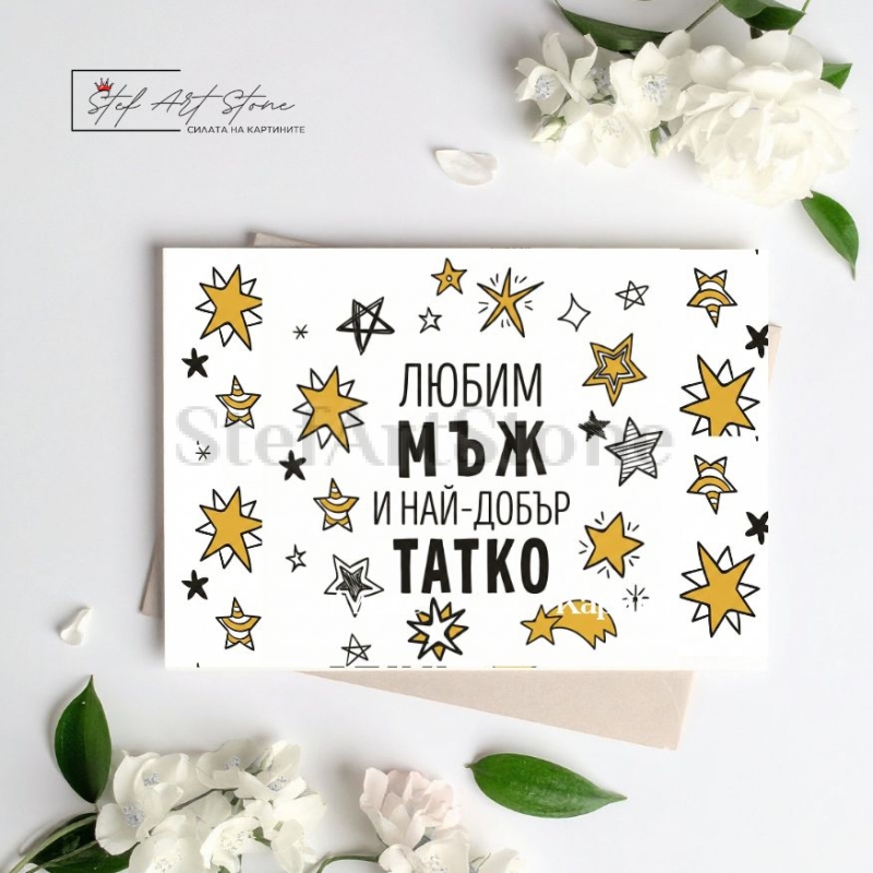 Подаръчна Картичка за Татко със Звезди и Надпис - Любим Мъж и Най-Добър Татко