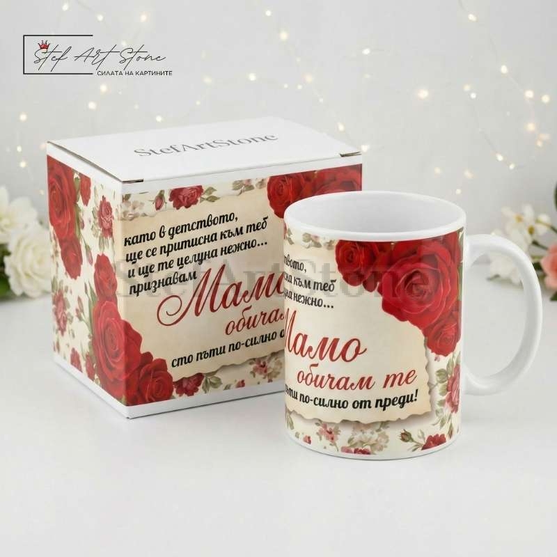 Дизайнът е класически и непреходен – декориран с наситени червени рози и съдържащ едно от най-милите признания: "както в детството... признавам МАМО обичам те сто пъти по-силно от преди!". Нашите чаши за подарък са създадени, за да носят радост в ежедневието, а този модел гарантирано ще стане нейната любима чаша за чай или кафе.