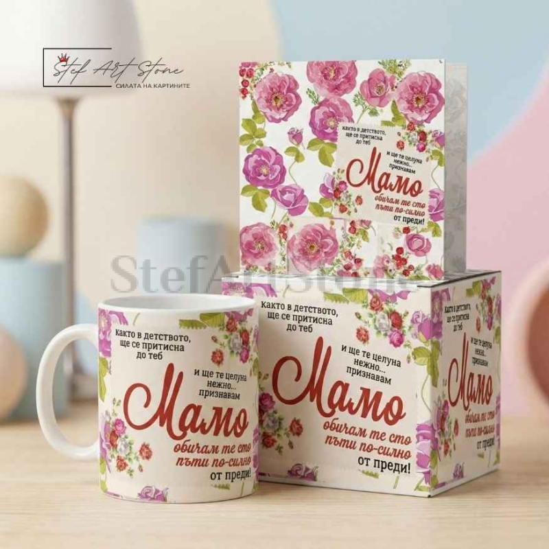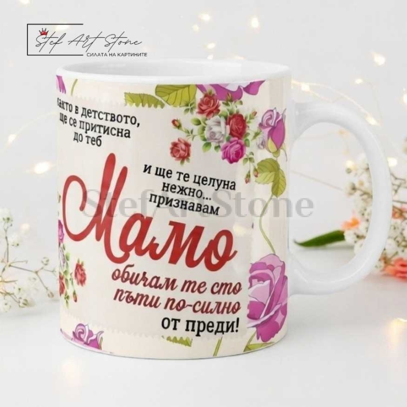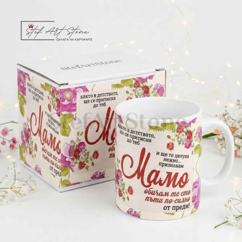 Дизайнът е нежен и елегантен – декориран с красиви розови рози във винтидж стил и съдържащ едно от най-милите признания: "както в детството... признавам МАМО обичам те сто пъти по-силно от преди!". Нашите чаши за подарък са създадени, за да носят радост в ежедневието, а този модел гарантирано ще стане нейната любима чаша за чай или кафе.
