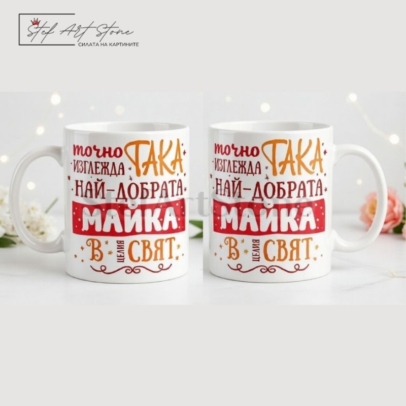 Дизайнът е изключително свеж и разчита на силата на думите – красиво оформен текст със звезди и акценти, който гласи: "точно ТАКА изглежда НАЙ-ДОБРАТА МАЙКА в целия СВЯТ". Нашите чаши за подарък са създадени, за да носят усмивки в ежедневието, а този модел гарантирано ще стане нейната любима чаша за кафе.