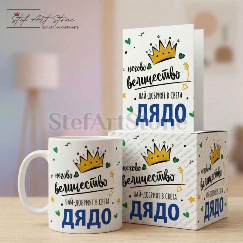 Подаръчен Комплект за Дядо: Чаша и Картичка с Надпис НАЙ-ДОБРИЯТ В СВЕТА ДЯДО