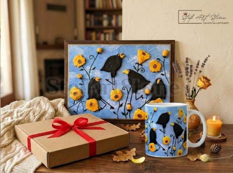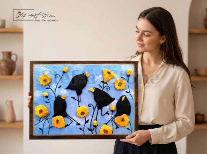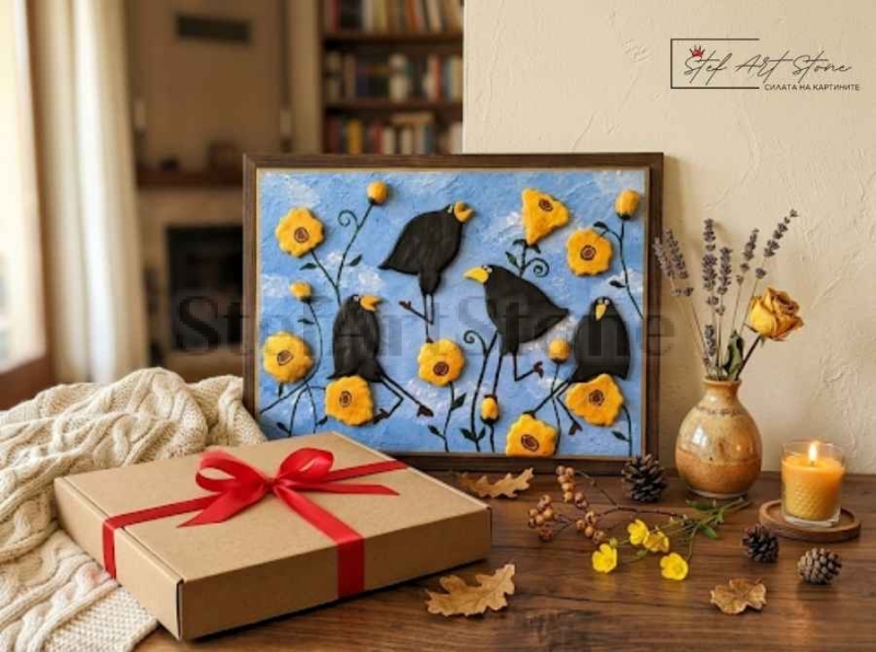 Творбата представлява картина с птици, изобразяваща комични черни врани сред ярки жълти цветя на лазурен фон. Всички фигури са изработени от глина, което придава на произведението изключителна релефност и живот. Нашите ръчно изработени картини са създадени да носят емоция, а тази композиция е перфектна изненада за нов дом, офис или рожден ден на човек с неподправено чувство за хумор.
