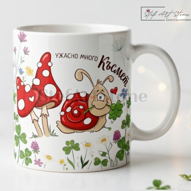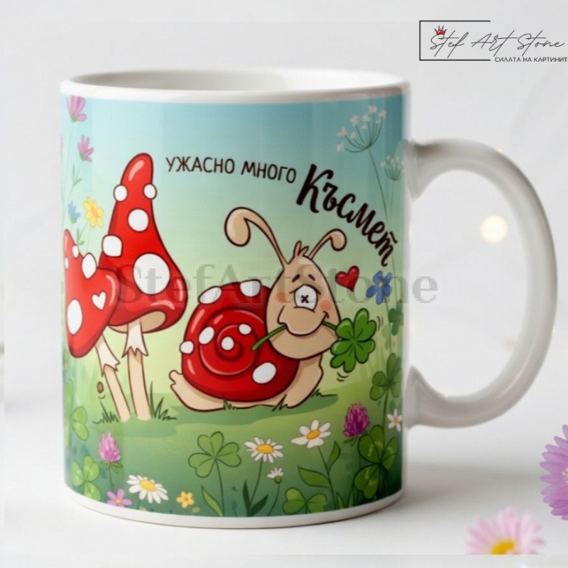 Дизайнът е истинска експлозия от настроение. Върху чашата са отпечатани изключително симпатични мотиви със забавно охлювче, държащо четирилистна детелина, допълнено от гъбки със сърчица и надписа: "УЖАСНО МНОГО Късмет". За да пасне идеално на вашия вкус, предлагаме този модел в две вариации – с изчистен бял фон, който акцентира върху героите, или с прекрасен, завършен цветен пейзаж.