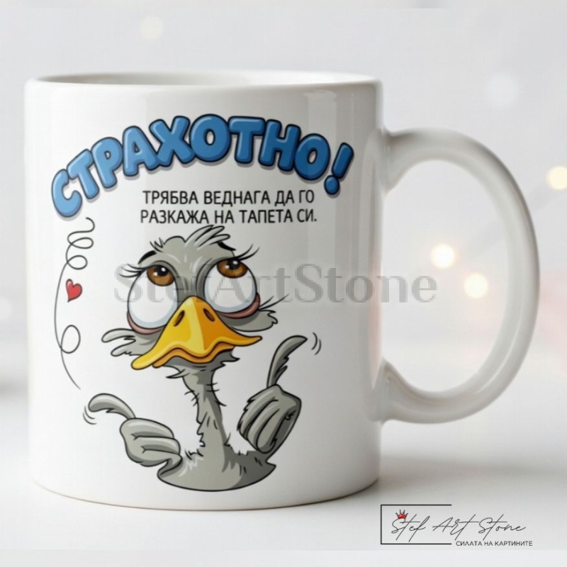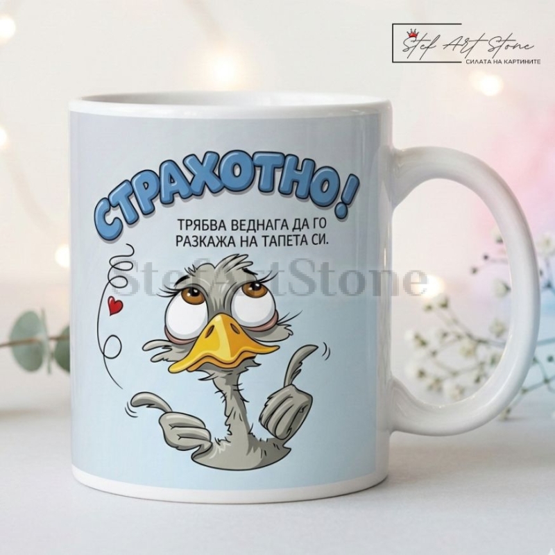 Дизайнът е създаден да бъде вашето лично антистрес (и анти-скука) оръжие. Върху чашата са отпечатани изключително комични мотиви със смешна птица и брутално точния надпис: "СТРАХОТНО! ТРЯБВА ВЕДНАГА ДА ГО РАЗКАЖА НА ТАПЕТА СИ.". За да пасне идеално на вашия стил, предлагаме този модел в две вариации – на светлосин или на класически бял фон.
