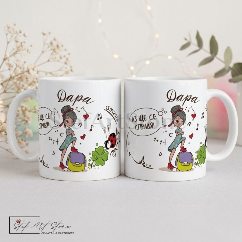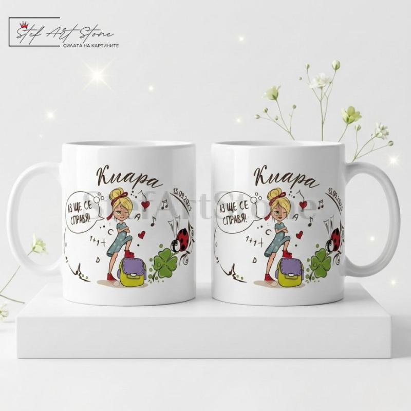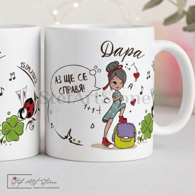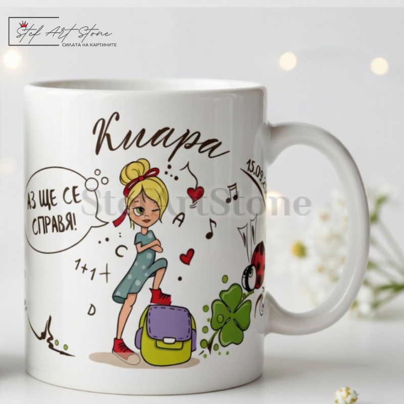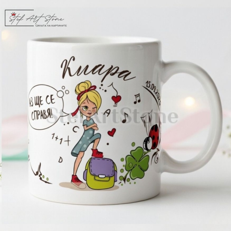 Дизайнът е съобразен изцяло с емоцията на празника. Върху чашата са изобразени красиви тематични мотиви – усмихнато момиче с раница, заобиколено от букви, цифри, ноти и символи на късмета. За да направим този подарък абсолютно уникален, ние ще отпечатаме името на детето и датата на празника (напр. 15 септември), превръщайки продукта в прекрасен спомен.