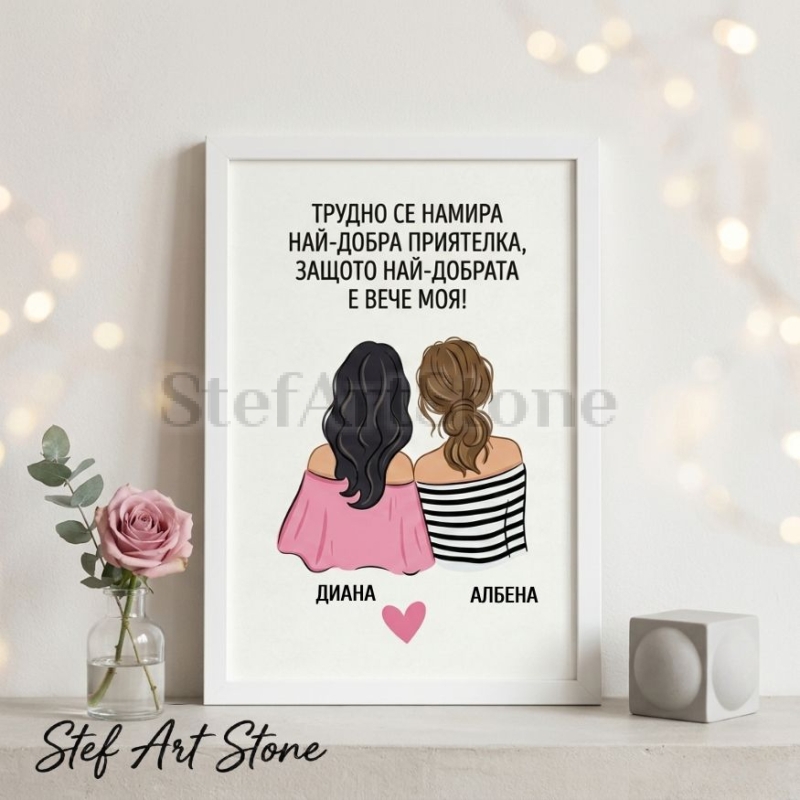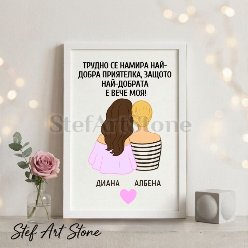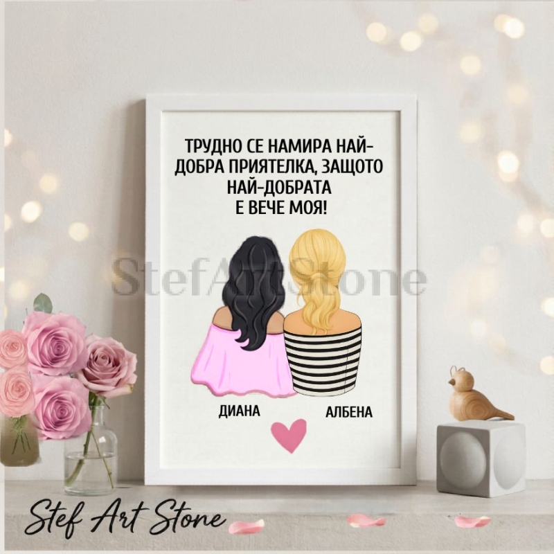 Дизайнът предлага нежна илюстрация на две момичета, като вие имате свободата да изберете цвета на косите им от нашите варианти, за да постигнете максимална визуална прилика. В комбинация с добавените ваши лични имена и силното послание "Трудно се намира най-добра приятелка, защото най-добрата е вече моя!", този артикул се превръща в изключително ценен и емоционален спомен.
