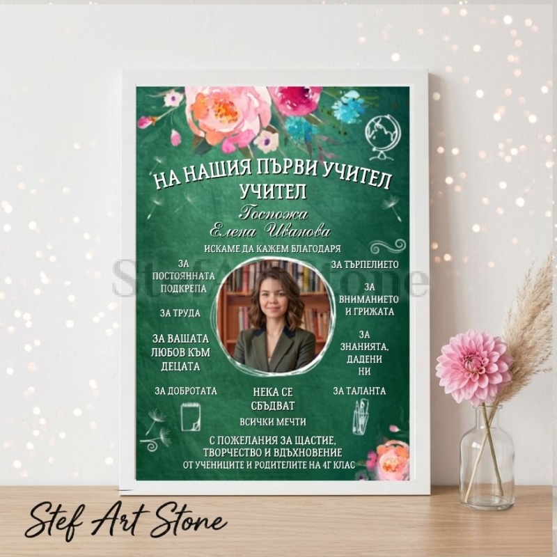 Това е подаръкът, който разплаква от радост. Той събира в една рамка лицето на любимия учител, признателността на целия клас и визия, която гордо ще стои в нейния дом или кабинет.