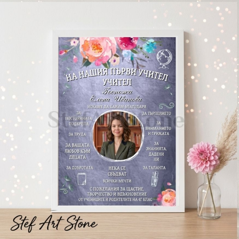 Раздялата с първия учител след завършването на 4-ти клас е момент, който остава завинаги в сърцата на децата и родителите. Този персонализиран постер с рамка и снимка "На Нашия Първи Учител" е създаден, за да изрази огромната благодарност за положените основи, грижата и любовта през тези първи ученически години.