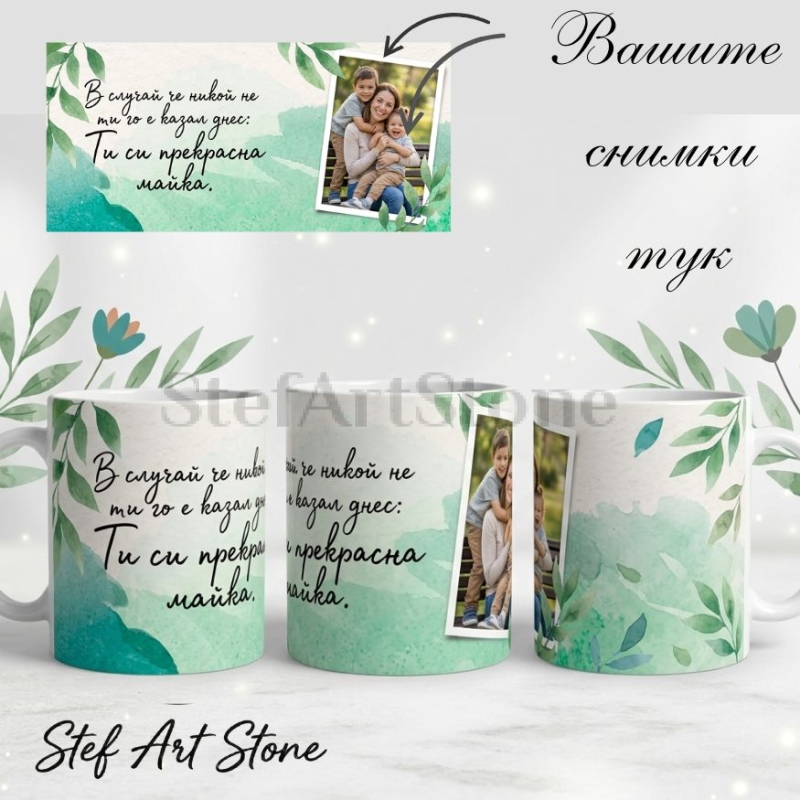 • Тип продукт: Висококачествена керамична чаша за сублимационен печат. • Вместимост: Стандартна 330 мл. • Материал: Бяла керамика отвътре, плътен цветен печат отвън. • Дизайн: Зелен акварелен фон с листа и утвърждаващ надпис за майката. • Персонализация: Вграждане на 1 брой Ваша снимка. • Опаковка: Включена подаръчна кутия.