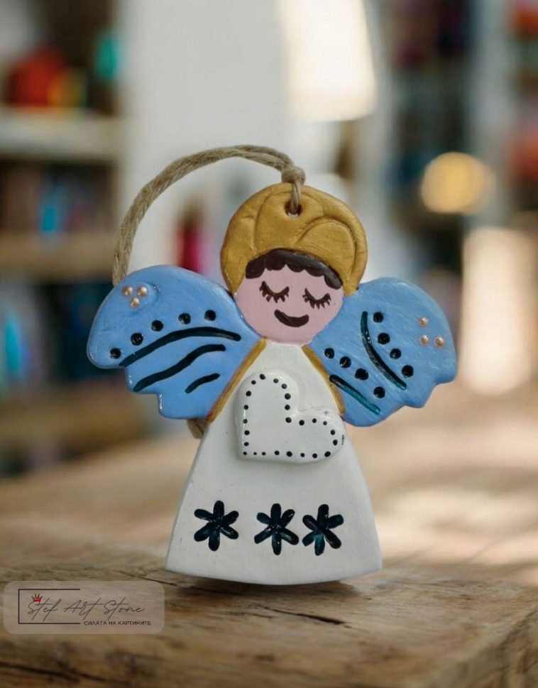 - Дизайн: Бяла дреха, светлосини крила, окачване с канап и мъниста.