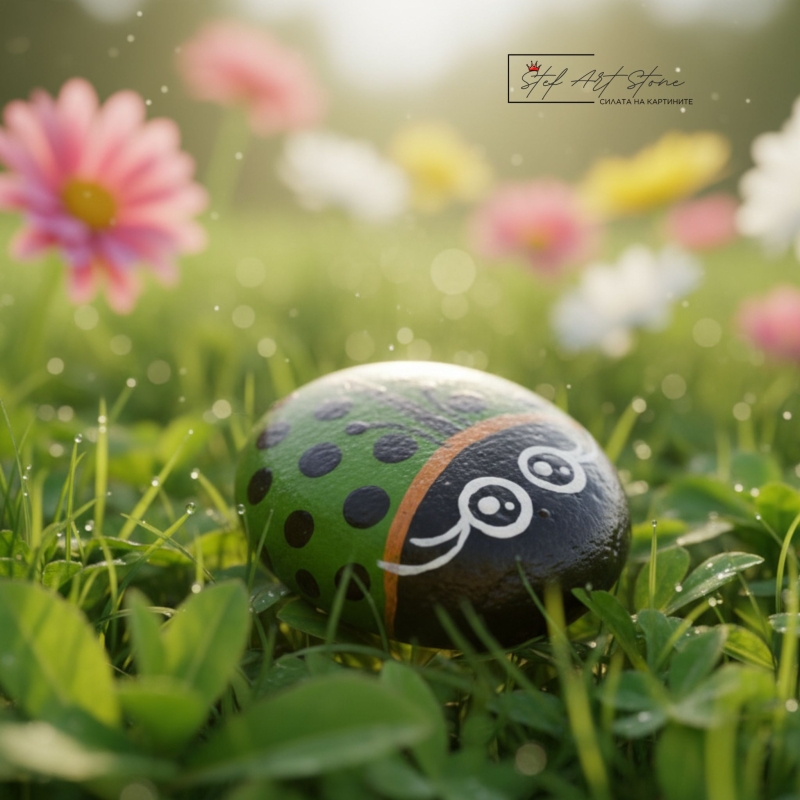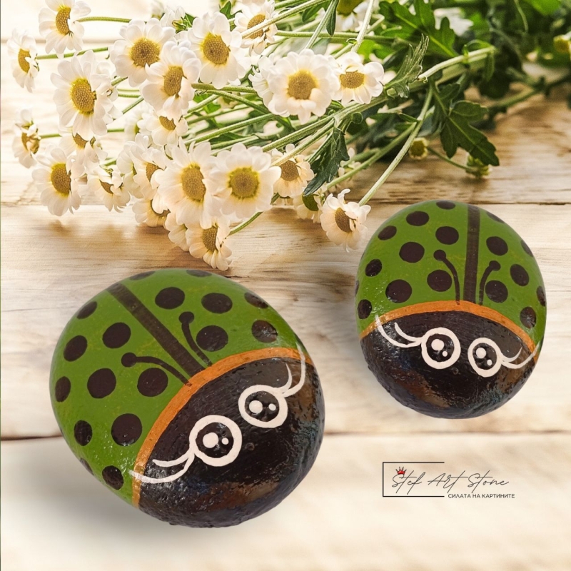 Рисуван камък зелена калинка | Арт декорация | Stef Art Stone