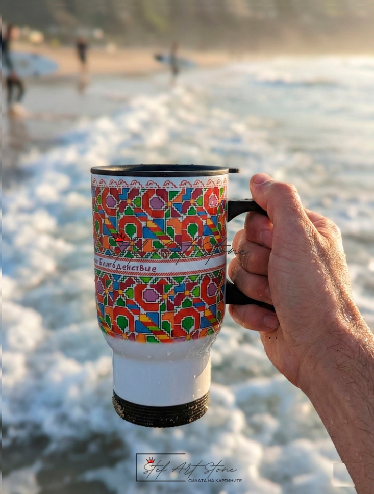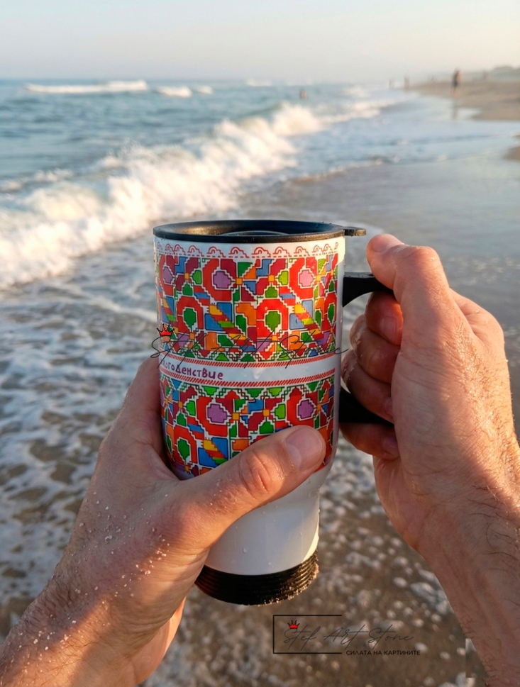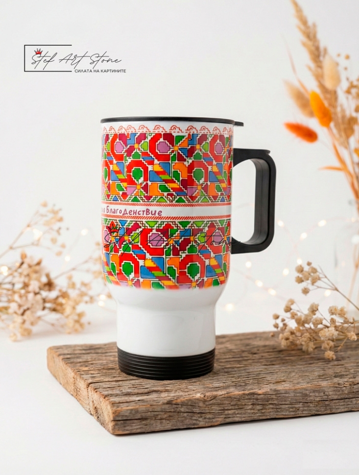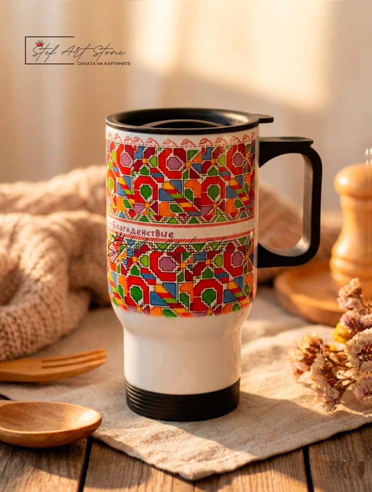 Термо чаша за кола (500 мл) с дръжка и капак против разливане. Декорирана с българска шевица и надпис „Здраве, Закрила и Благоденствие“. Пасва в поставка за автомобил. Практична за кафе и чай – в движение или в офиса.