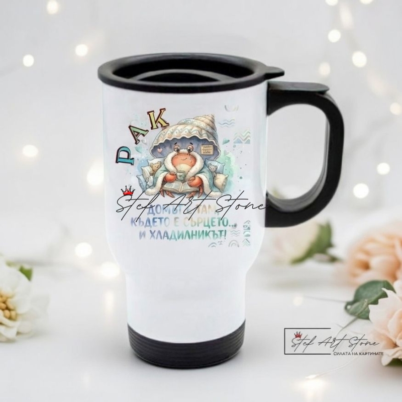 Термо Чаша Зодия Рак – "Домът е там, където е хладилникът" (За Път и Кола 500 мл)