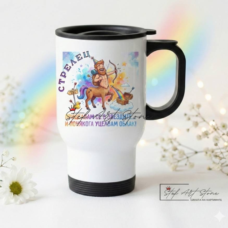Термо Чаша Зодия Стрелец – "Прицелвам се в звездите" (За Път и Кола 500 мл)