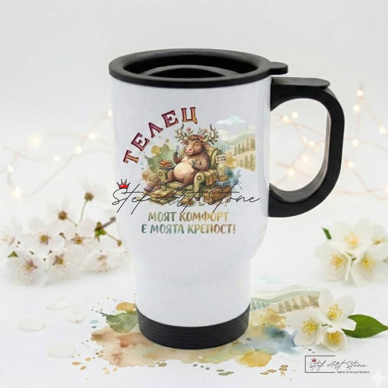 Термо Чаша Зодия Телец – "Моят комфорт е моята крепост" (За Път и Кола 500 мл