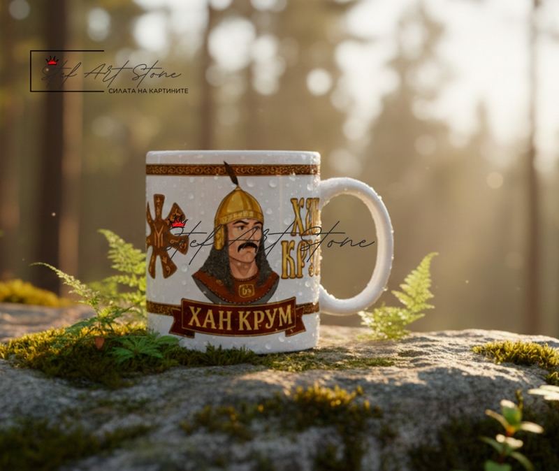 Бяла керамична чаша с портрет на Хан Крум и Розетата от Плиска. Дизайнът включва стилен банер с името на хана и декоративни бордове. Символичен подарък, носещ послание за справедливост и сила.