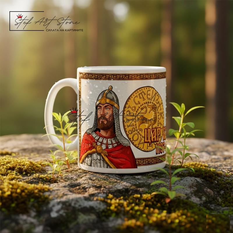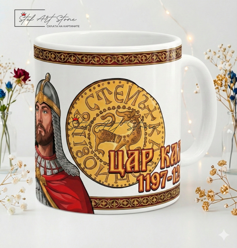 - Царствена визия: Портретът на Калоян е рамкиран от красиви златни бордове (горе и долу), които придават завършен и луксозен вид на чашата.