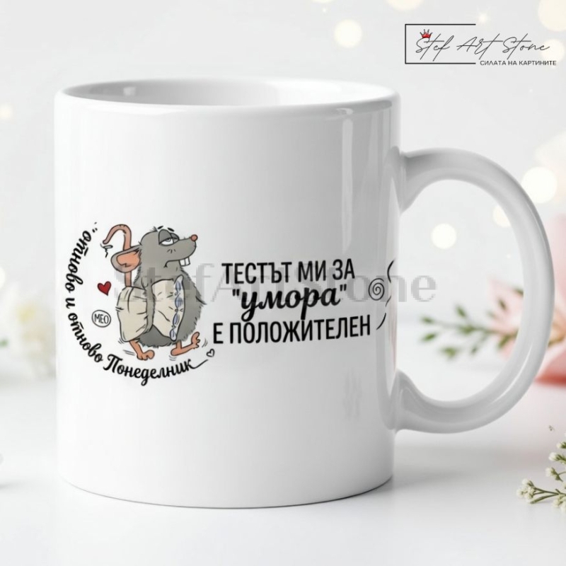 Дизайнът е създаден, за да предизвиква искрен смях и да носи утеха. Върху чашата са отпечатани комични мотиви на изключително уморена мишка, помъкнала възглавница със себе си. Картината е перфектно допълнена от брутално откровените надписи: "отново и отново... Понеделник" и "ТЕСТЪТ МИ ЗА 'умора' Е ПОЛОЖИТЕЛЕН". Това превръща сутрешното кафе в задължителен ритуал по оцеляване!