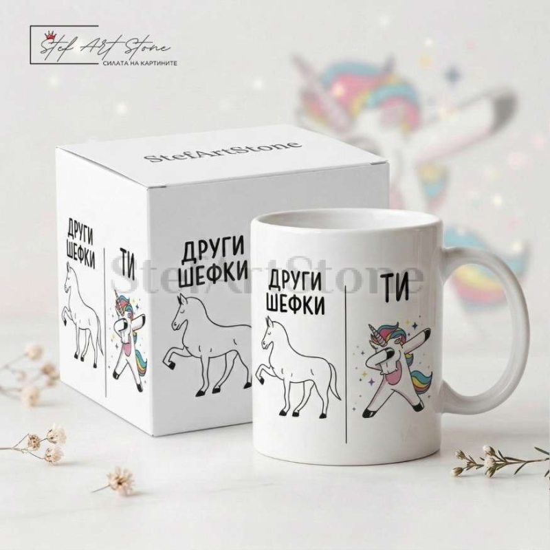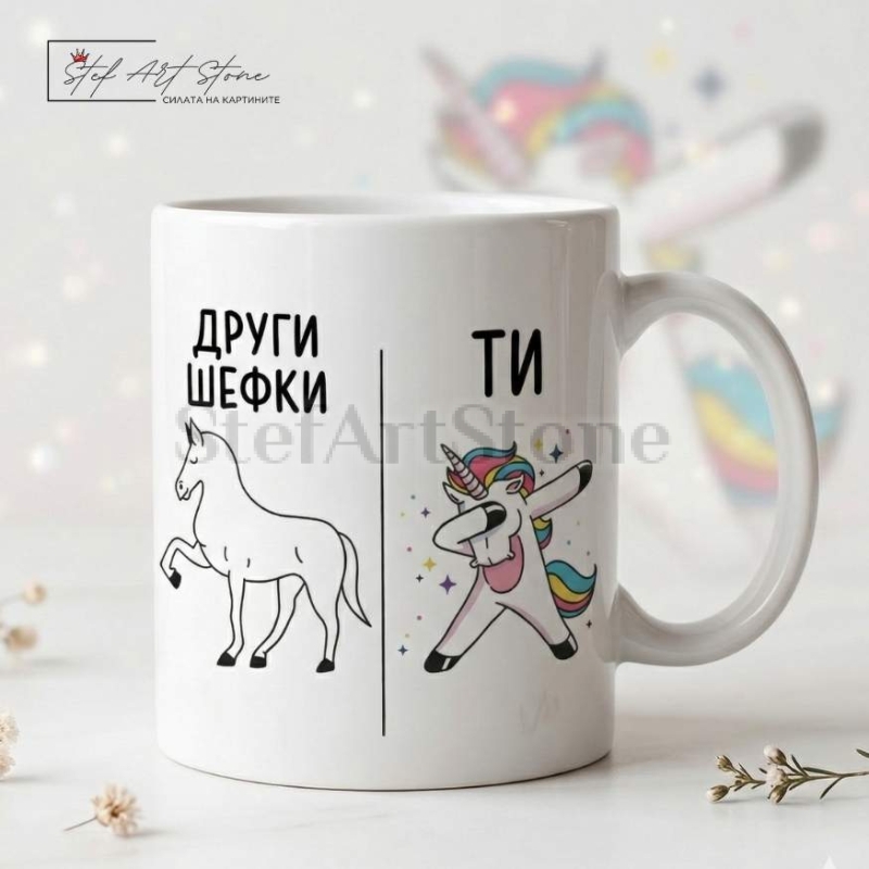 Дизайнът е брилянтен в своята простота. Той разделя света на две: от едната страна са "ДРУГИ ШЕФКИ", изобразени като съвсем обикновен, скучен кон. От другата страна е категорията "ТИ" – представена от невероятно готин, цветен и модерен еднорог. Нашите забавни чаши са създадени да носят настроение, а този модел гарантирано ще заеме почетно място на шефското бюро!