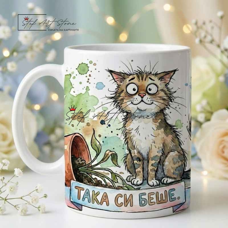 Тази чаша улавя мига на "престъплението". Бутнатата саксия, разсипаната пръст и котето, което те гледа право в очите с изражение на пълна невинност. Фразата "ТАКА СИ БЕШЕ." е универсалното алиби на всеки домашен любимец.